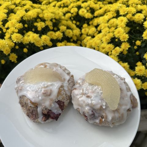 ‘Pear & Blackberry’ Our famous giant Poplars scone filled with sweet pear & tart blackberries. This is the perfect combination of early autumn harvest and hedgerow to get you in the mood for the new season. Best enjoyed with coffee & friends in our cosy Little Beans coffee shop.